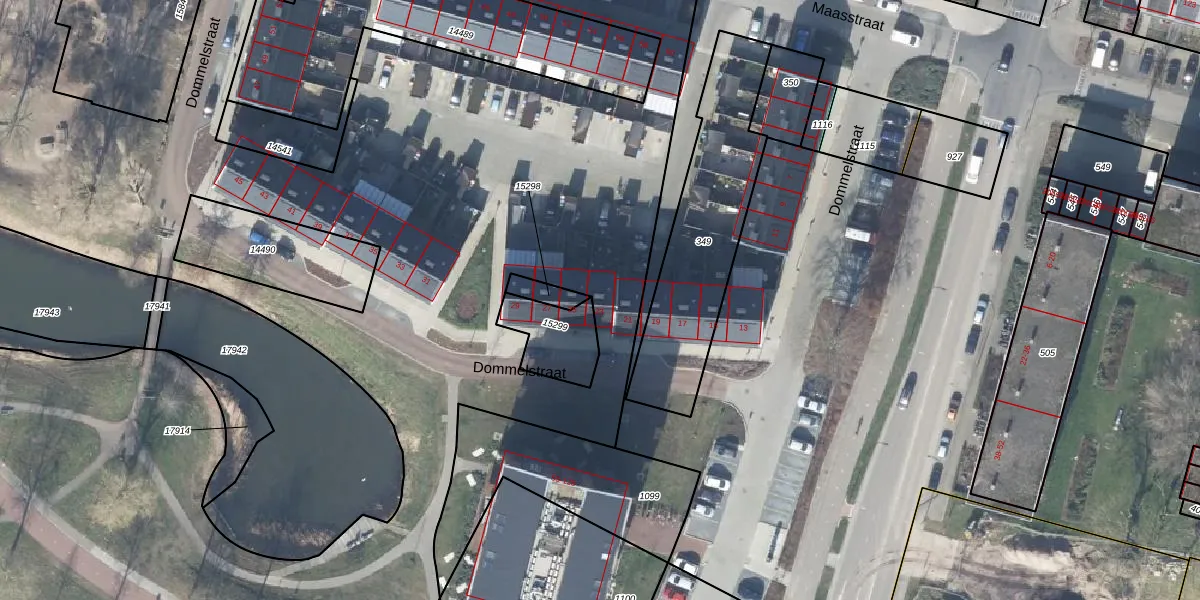 Het perceel waarop Dommelstraat 23 staat heeft een oppervlakte van 12,1 ha. Dit is een zeer groot perceel. De perceeloppervlakte wordt geregistreerd door het Kadaster. Gedetailleerde informatie over de maten van dit perceel kunt u vinden in het rapport Kadastrale kaart met maatvoering van Dommelstraat 23.
