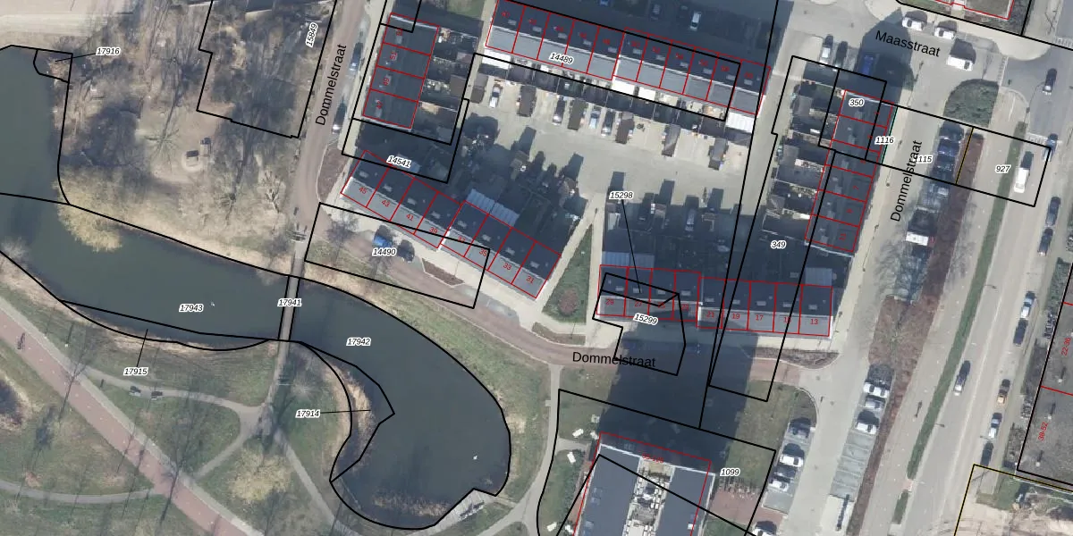 Het perceel waarop Dommelstraat 31 staat heeft een oppervlakte van 12,1 ha. Dit is een zeer groot perceel. De perceeloppervlakte wordt geregistreerd door het Kadaster. Gedetailleerde informatie over de maten van dit perceel kunt u vinden in het rapport Kadastrale kaart met maatvoering van Dommelstraat 31.