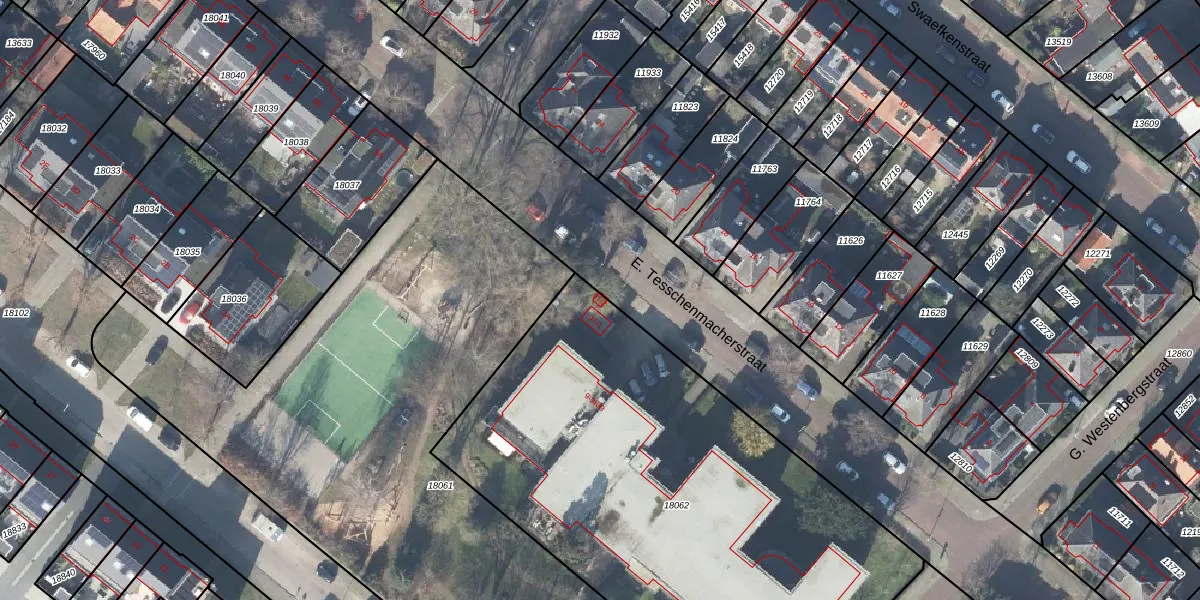 Het perceel waarop E. Tesschenmacherstraat 9-T-2 staat heeft een oppervlakte van 2880 m². Dit is een zeer groot perceel. De perceeloppervlakte wordt geregistreerd door het Kadaster. Gedetailleerde informatie over de maten van dit perceel kunt u vinden in het rapport Kadastrale kaart met maatvoering van E. Tesschenmacherstraat 9-T-2.