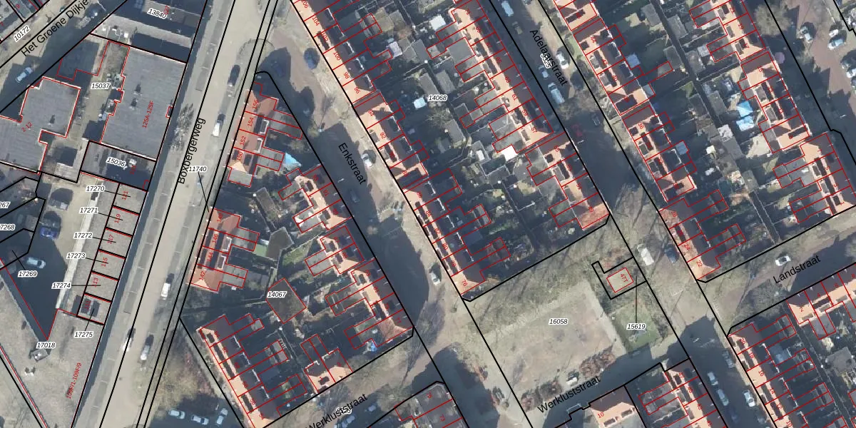 Het perceel waarop Enkstraat 84 staat heeft een oppervlakte van 3388 m². Dit is een zeer groot perceel. De perceeloppervlakte wordt geregistreerd door het Kadaster. Gedetailleerde informatie over de maten van dit perceel kunt u vinden in het rapport Kadastrale kaart met maatvoering van Enkstraat 84.