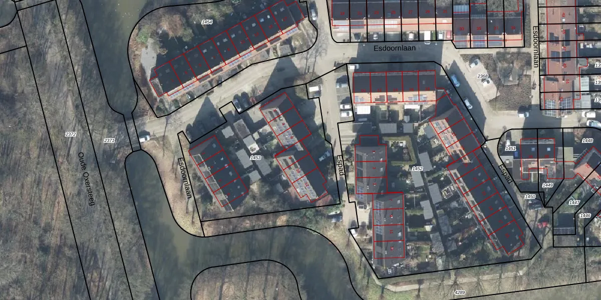 Het perceel waarop Espad 8 staat heeft een oppervlakte van 1681 m². Dit is een zeer groot perceel. De perceeloppervlakte wordt geregistreerd door het Kadaster. Gedetailleerde informatie over de maten van dit perceel kunt u vinden in het rapport Kadastrale kaart met maatvoering van Espad 8.
