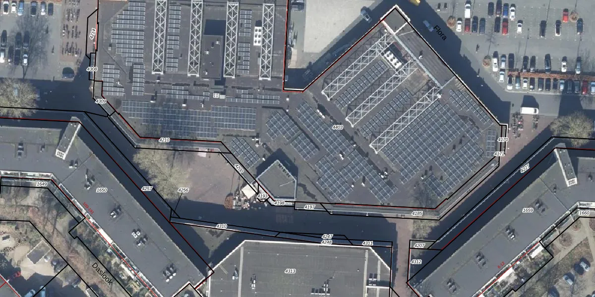 Het perceel waarop Flora 36 staat heeft een oppervlakte van 6719 m². Dit is een zeer groot perceel. De perceeloppervlakte wordt geregistreerd door het Kadaster. Gedetailleerde informatie over de maten van dit perceel kunt u vinden in het rapport Kadastrale kaart met maatvoering van Flora 36.