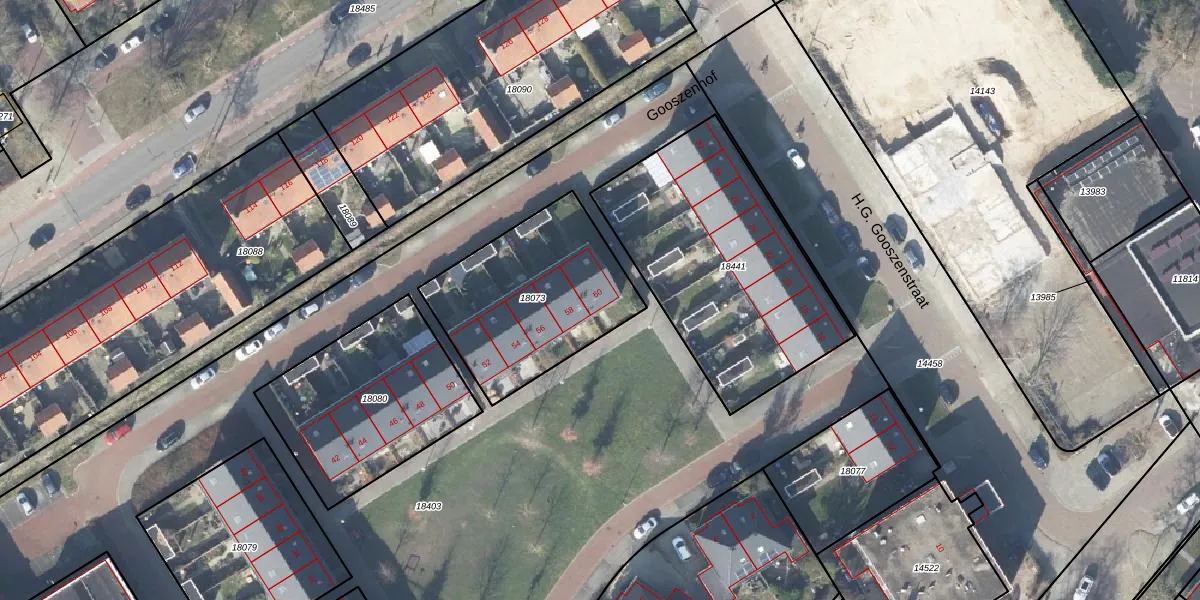 Het perceel waarop Gooszenhof 60 staat heeft een oppervlakte van 707 m². Dit is een groot perceel. De perceeloppervlakte wordt geregistreerd door het Kadaster. Gedetailleerde informatie over de maten van dit perceel kunt u vinden in het rapport Kadastrale kaart met maatvoering van Gooszenhof 60.