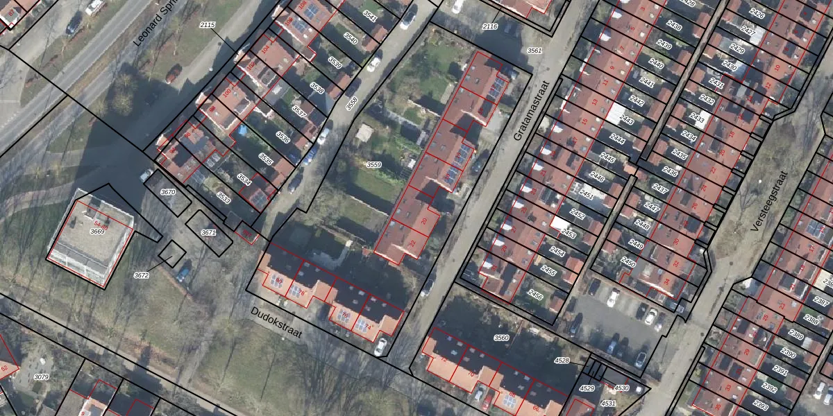 Het perceel waarop Gratamastraat 20 staat heeft een oppervlakte van 2579 m². Dit is een zeer groot perceel. De perceeloppervlakte wordt geregistreerd door het Kadaster. Gedetailleerde informatie over de maten van dit perceel kunt u vinden in het rapport Kadastrale kaart met maatvoering van Gratamastraat 20.