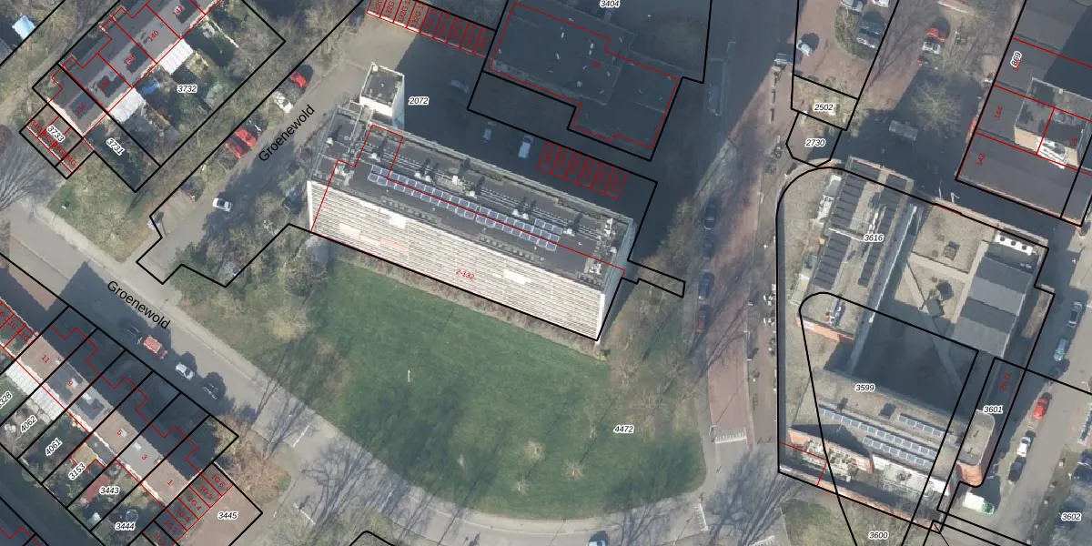 Het perceel waarop Groenewold 40 staat heeft een oppervlakte van 3089 m². Dit is een zeer groot perceel. De perceeloppervlakte wordt geregistreerd door het Kadaster. Gedetailleerde informatie over de maten van dit perceel kunt u vinden in het rapport Kadastrale kaart met maatvoering van Groenewold 40.