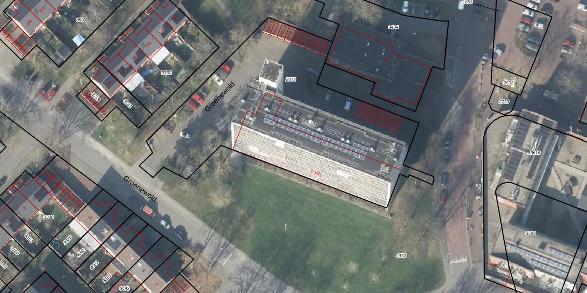 Het perceel waarop Groenewold 54 staat heeft een oppervlakte van 3089 m². Dit is een zeer groot perceel. De perceeloppervlakte wordt geregistreerd door het Kadaster. Gedetailleerde informatie over de maten van dit perceel kunt u vinden in het rapport Kadastrale kaart met maatvoering van Groenewold 54.