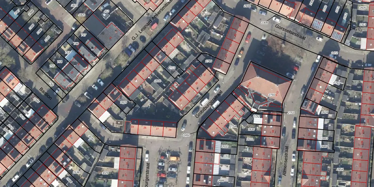 Het perceel waarop Grootburgerstraat 33 staat heeft een oppervlakte van 2915 m². Dit is een zeer groot perceel. De perceeloppervlakte wordt geregistreerd door het Kadaster. Gedetailleerde informatie over de maten van dit perceel kunt u vinden in het rapport Kadastrale kaart met maatvoering van Grootburgerstraat 33.