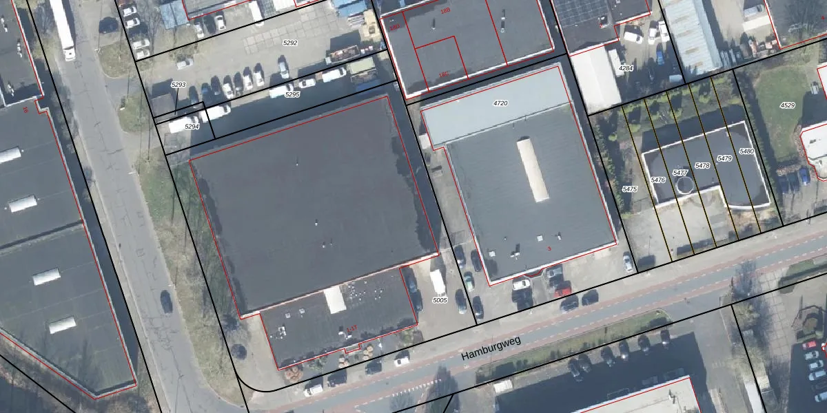 Het perceel waarop Hamburgweg 1-T staat heeft een oppervlakte van 3668 m². Dit is een zeer groot perceel. De perceeloppervlakte wordt geregistreerd door het Kadaster. Gedetailleerde informatie over de maten van dit perceel kunt u vinden in het rapport Kadastrale kaart met maatvoering van Hamburgweg 1-T.