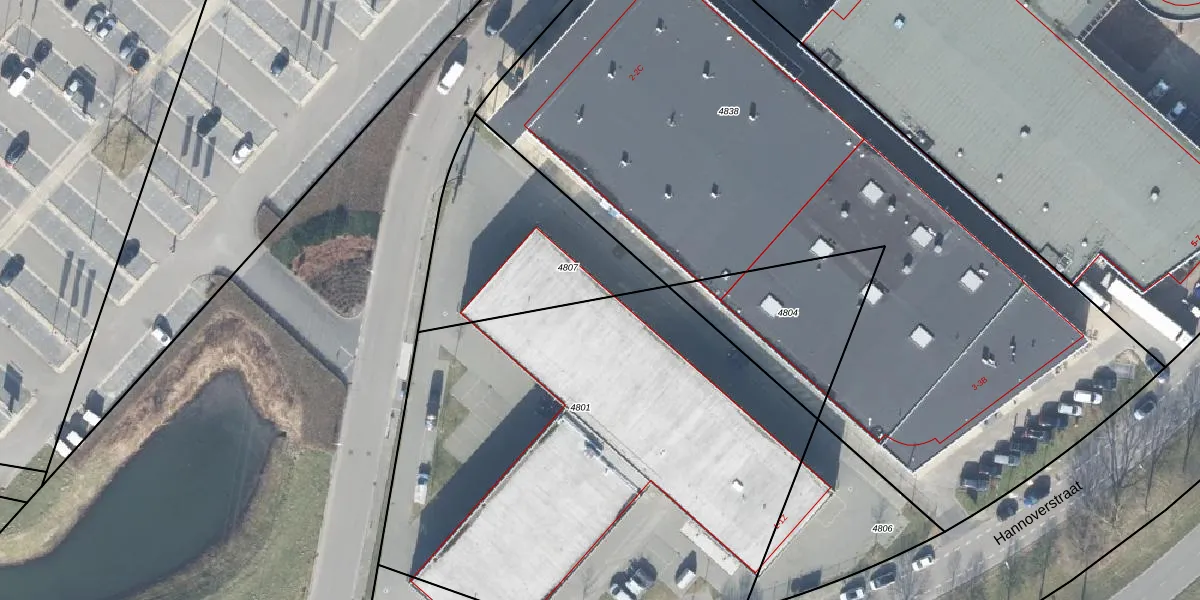 Het perceel waarop Hannoverstraat 1-BD staat heeft een oppervlakte van 3205 m². Dit is een zeer groot perceel. De perceeloppervlakte wordt geregistreerd door het Kadaster. Gedetailleerde informatie over de maten van dit perceel kunt u vinden in het rapport Kadastrale kaart met maatvoering van Hannoverstraat 1-BD.