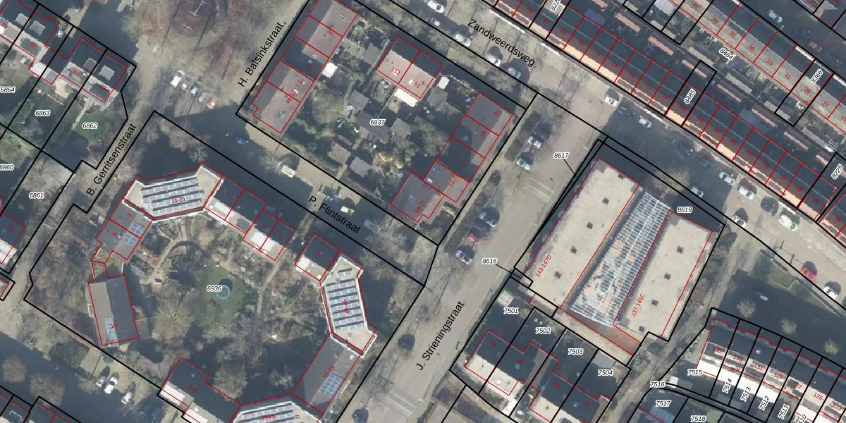 Het perceel waarop J. Strieningstraat 69 staat heeft een oppervlakte van 2186 m². Dit is een zeer groot perceel. De perceeloppervlakte wordt geregistreerd door het Kadaster. Gedetailleerde informatie over de maten van dit perceel kunt u vinden in het rapport Kadastrale kaart met maatvoering van J. Strieningstraat 69.