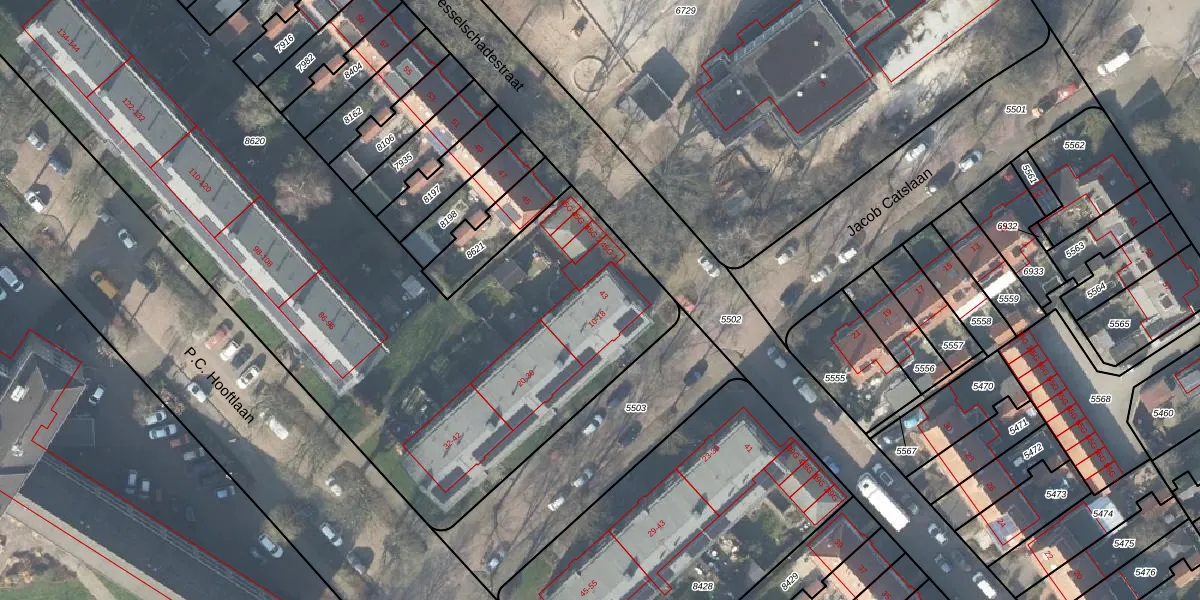 Het perceel waarop Jacob Catslaan 12 staat heeft een oppervlakte van 5752 m². Dit is een zeer groot perceel. De perceeloppervlakte wordt geregistreerd door het Kadaster. Gedetailleerde informatie over de maten van dit perceel kunt u vinden in het rapport Kadastrale kaart met maatvoering van Jacob Catslaan 12.
