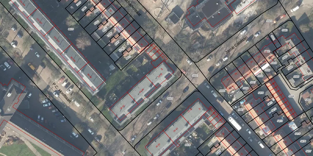 Het perceel waarop Jacob Catslaan 16 staat heeft een oppervlakte van 5752 m². Dit is een zeer groot perceel. De perceeloppervlakte wordt geregistreerd door het Kadaster. Gedetailleerde informatie over de maten van dit perceel kunt u vinden in het rapport Kadastrale kaart met maatvoering van Jacob Catslaan 16.