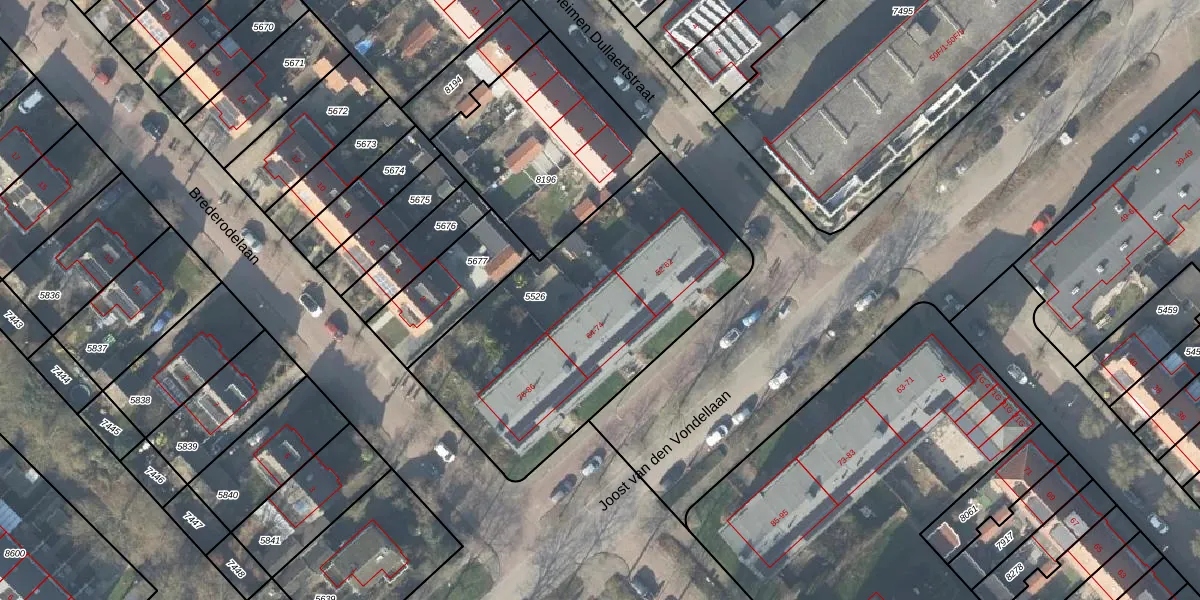 Het perceel waarop Joost van den Vondellaan 68 staat heeft een oppervlakte van 1434 m². Dit is een zeer groot perceel. De perceeloppervlakte wordt geregistreerd door het Kadaster. Gedetailleerde informatie over de maten van dit perceel kunt u vinden in het rapport Kadastrale kaart met maatvoering van Joost van den Vondellaan 68.