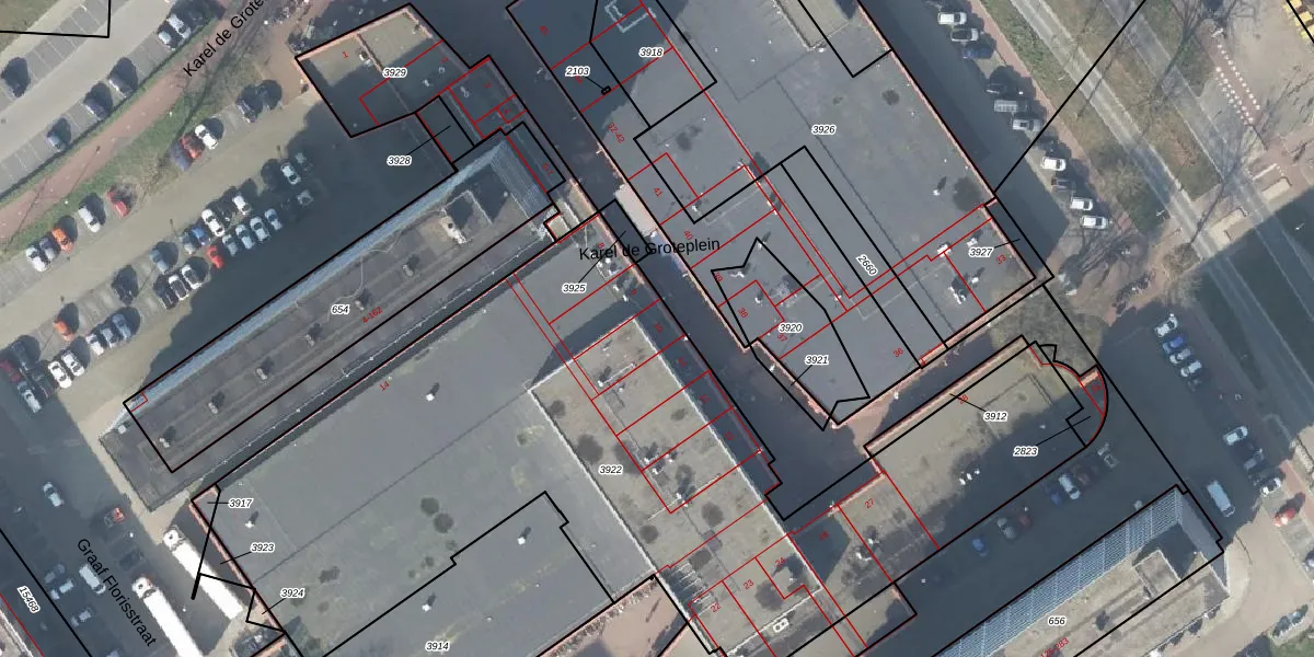 Het perceel waarop Karel de Groteplein 10 staat heeft een oppervlakte van 4150 m². Dit is een zeer groot perceel. De perceeloppervlakte wordt geregistreerd door het Kadaster. Gedetailleerde informatie over de maten van dit perceel kunt u vinden in het rapport Kadastrale kaart met maatvoering van Karel de Groteplein 10.