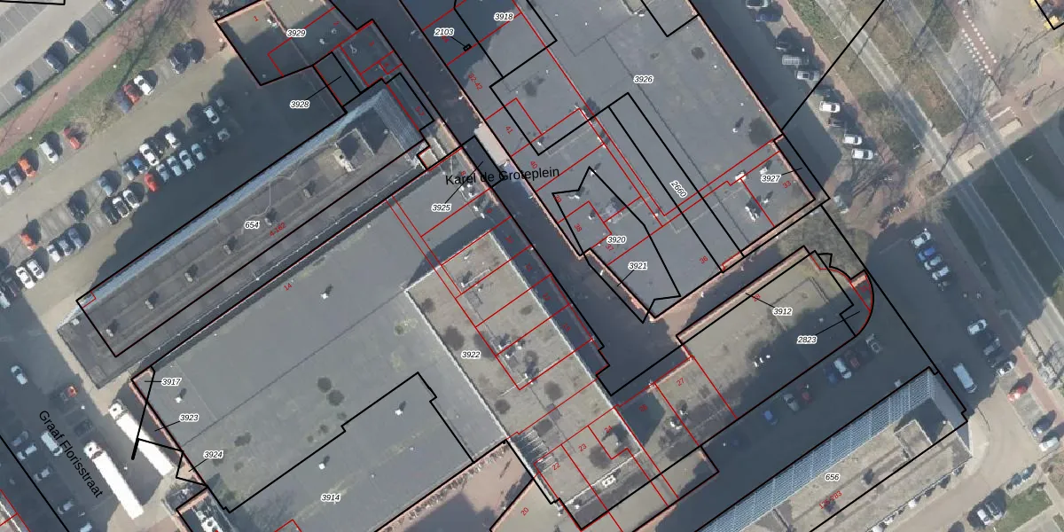 Het perceel waarop Karel de Groteplein 11 staat heeft een oppervlakte van 4150 m². Dit is een zeer groot perceel. De perceeloppervlakte wordt geregistreerd door het Kadaster. Gedetailleerde informatie over de maten van dit perceel kunt u vinden in het rapport Kadastrale kaart met maatvoering van Karel de Groteplein 11.