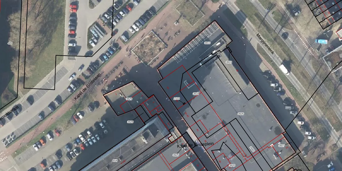 Het perceel waarop Karel de Groteplein 45 staat heeft een oppervlakte van 1330 m². Dit is een zeer groot perceel. De perceeloppervlakte wordt geregistreerd door het Kadaster. Gedetailleerde informatie over de maten van dit perceel kunt u vinden in het rapport Kadastrale kaart met maatvoering van Karel de Groteplein 45.