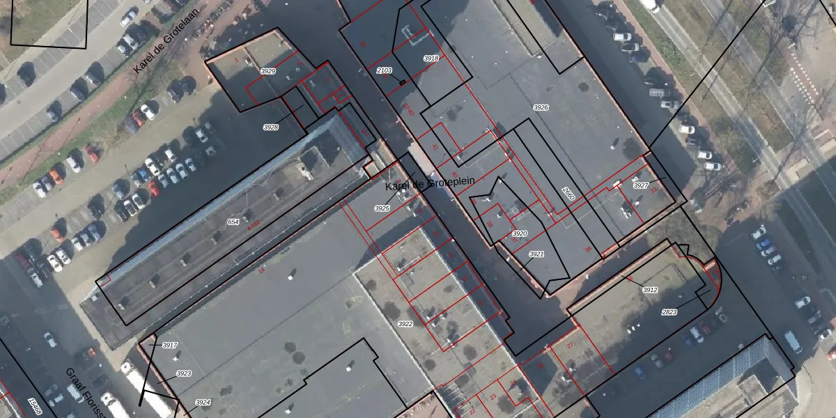 Het perceel waarop Karel de Groteplein 9 staat heeft een oppervlakte van 4150 m². Dit is een zeer groot perceel. De perceeloppervlakte wordt geregistreerd door het Kadaster. Gedetailleerde informatie over de maten van dit perceel kunt u vinden in het rapport Kadastrale kaart met maatvoering van Karel de Groteplein 9.