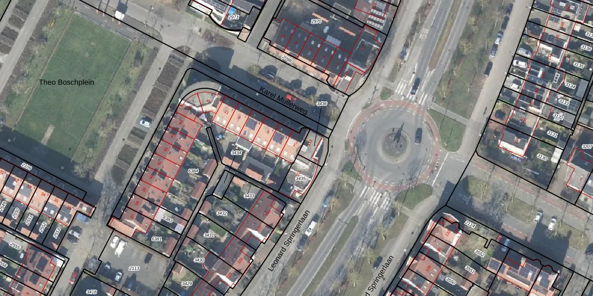 Het perceel waarop Karel Mullerweg 1 staat heeft een oppervlakte van 1350 m². Dit is een zeer groot perceel. De perceeloppervlakte wordt geregistreerd door het Kadaster. Gedetailleerde informatie over de maten van dit perceel kunt u vinden in het rapport Kadastrale kaart met maatvoering van Karel Mullerweg 1.