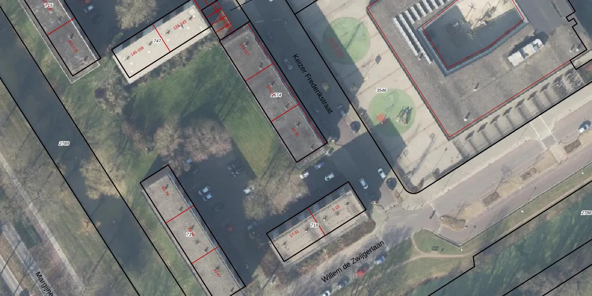 Het perceel waarop Keizer Frederikstraat 87 staat heeft een oppervlakte van 587 m². Dit is een groot perceel. De perceeloppervlakte wordt geregistreerd door het Kadaster. Gedetailleerde informatie over de maten van dit perceel kunt u vinden in het rapport Kadastrale kaart met maatvoering van Keizer Frederikstraat 87.