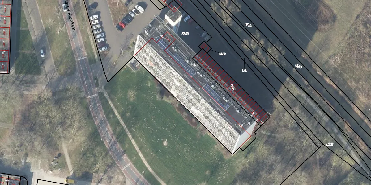 Het perceel waarop Keizer Karellaan 107 staat heeft een oppervlakte van 3830 m². Dit is een zeer groot perceel. De perceeloppervlakte wordt geregistreerd door het Kadaster. Gedetailleerde informatie over de maten van dit perceel kunt u vinden in het rapport Kadastrale kaart met maatvoering van Keizer Karellaan 107.