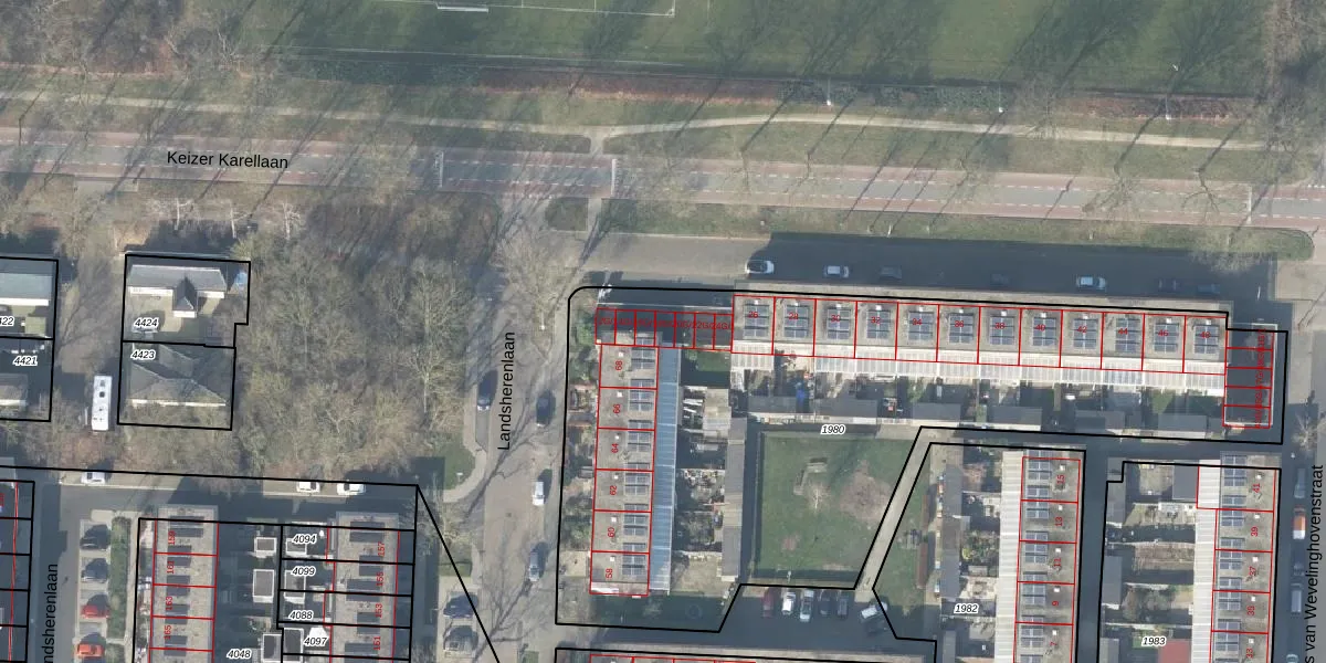 Het perceel waarop Keizer Karellaan 18-G-1 staat heeft een oppervlakte van 3470 m². Dit is een zeer groot perceel. De perceeloppervlakte wordt geregistreerd door het Kadaster. Gedetailleerde informatie over de maten van dit perceel kunt u vinden in het rapport Kadastrale kaart met maatvoering van Keizer Karellaan 18-G-1.