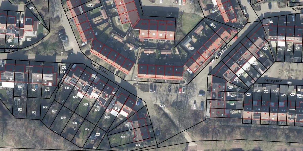 Het perceel waarop Korenbloem 23 staat heeft een oppervlakte van 5022 m². Dit is een zeer groot perceel. De perceeloppervlakte wordt geregistreerd door het Kadaster. Gedetailleerde informatie over de maten van dit perceel kunt u vinden in het rapport Kadastrale kaart met maatvoering van Korenbloem 23.