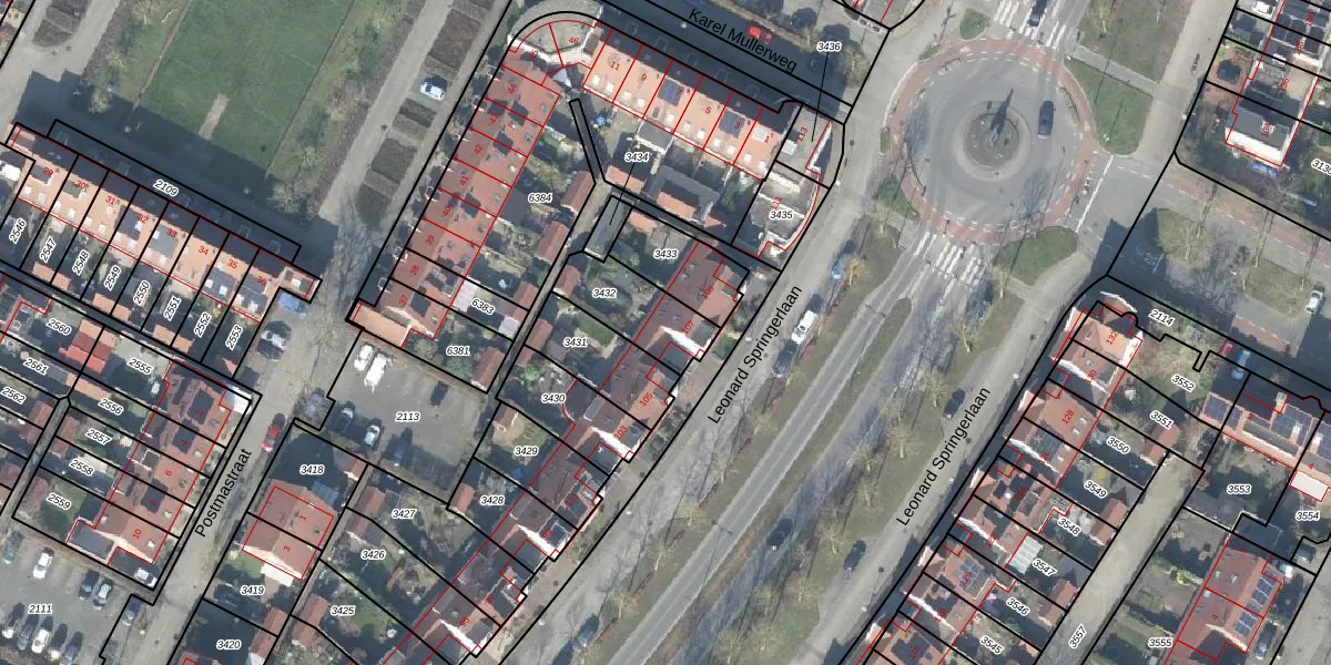 Het perceel waarop Leonard Springerlaan 107 staat heeft een oppervlakte van 215 m². Dit is een middelgroot perceel. De perceeloppervlakte wordt geregistreerd door het Kadaster. Gedetailleerde informatie over de maten van dit perceel kunt u vinden in het rapport Kadastrale kaart met maatvoering van Leonard Springerlaan 107.