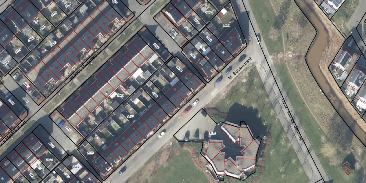 Het perceel waarop M. Bossestraat 12 staat heeft een oppervlakte van 1315 m². Dit is een zeer groot perceel. De perceeloppervlakte wordt geregistreerd door het Kadaster. Gedetailleerde informatie over de maten van dit perceel kunt u vinden in het rapport Kadastrale kaart met maatvoering van M. Bossestraat 12.