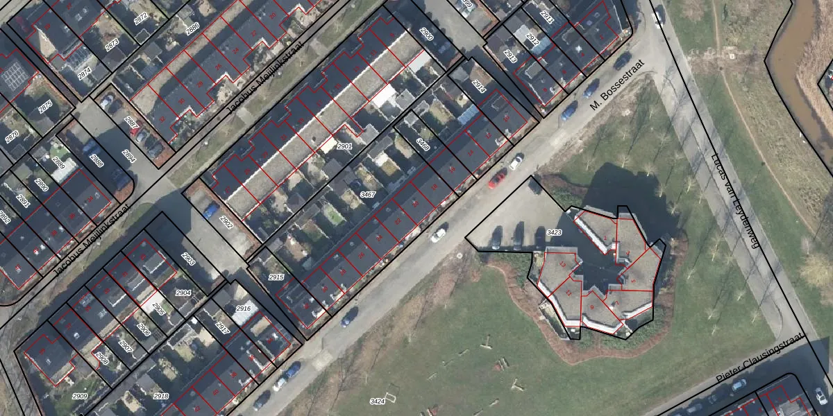 Het perceel waarop M. Bossestraat 20 staat heeft een oppervlakte van 1315 m². Dit is een zeer groot perceel. De perceeloppervlakte wordt geregistreerd door het Kadaster. Gedetailleerde informatie over de maten van dit perceel kunt u vinden in het rapport Kadastrale kaart met maatvoering van M. Bossestraat 20.