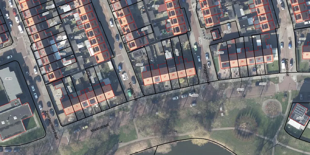 Het perceel waarop Maasstraat 15 staat heeft een oppervlakte van 3035 m². Dit is een zeer groot perceel. De perceeloppervlakte wordt geregistreerd door het Kadaster. Gedetailleerde informatie over de maten van dit perceel kunt u vinden in het rapport Kadastrale kaart met maatvoering van Maasstraat 15.
