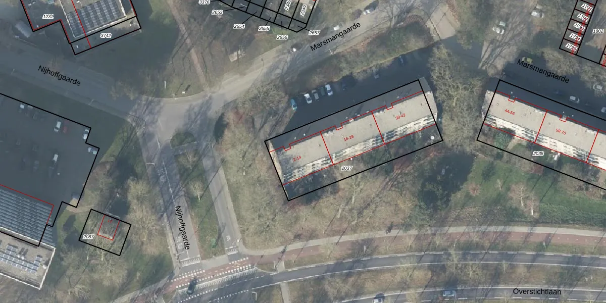 Marsmangaarde 14 is gelegen op kadastraal perceel DVT00F2037. Deze kadastrale aanduiding is uniek en wordt gebruikt door het Kadaster om eigendomsrechten en andere zakelijke rechten vast te leggen. Het perceel maakt onderdeel uit van de kadastrale gemeente Deventer.