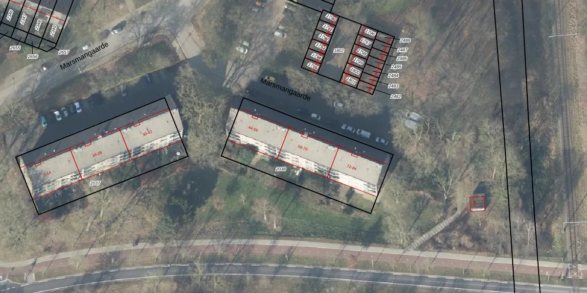 Het perceel waarop Marsmangaarde 62 staat heeft een oppervlakte van 1164 m². Dit is een zeer groot perceel. De perceeloppervlakte wordt geregistreerd door het Kadaster. Gedetailleerde informatie over de maten van dit perceel kunt u vinden in het rapport Kadastrale kaart met maatvoering van Marsmangaarde 62.