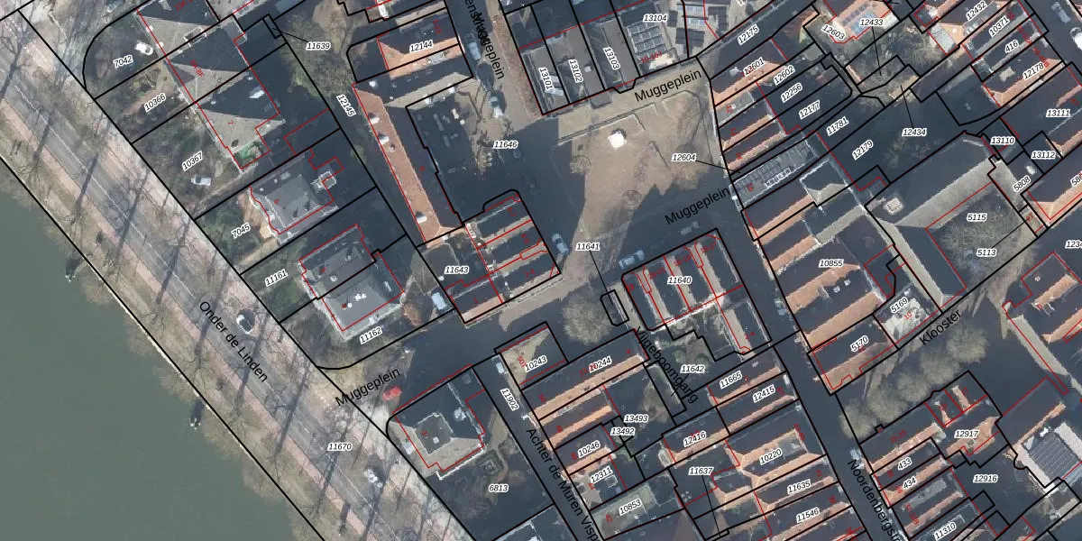 Het perceel waarop Muggeplein 2 staat heeft een oppervlakte van 365 m². Dit is een groot perceel. De perceeloppervlakte wordt geregistreerd door het Kadaster. Gedetailleerde informatie over de maten van dit perceel kunt u vinden in het rapport Kadastrale kaart met maatvoering van Muggeplein 2.