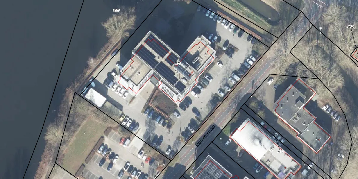 Het perceel waarop Munsterstraat 2-F staat heeft een oppervlakte van 5113 m². Dit is een zeer groot perceel. De perceeloppervlakte wordt geregistreerd door het Kadaster. Gedetailleerde informatie over de maten van dit perceel kunt u vinden in het rapport Kadastrale kaart met maatvoering van Munsterstraat 2-F.