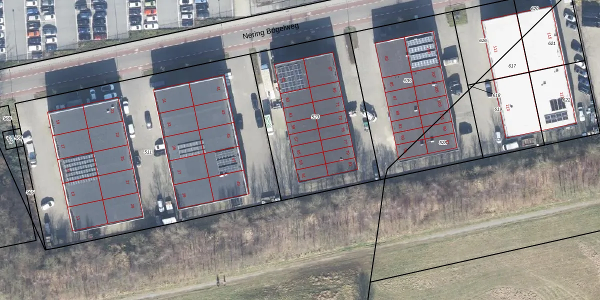 Het perceel waarop Nering Bögelweg 55 staat heeft een oppervlakte van 1684 m². Dit is een zeer groot perceel. De perceeloppervlakte wordt geregistreerd door het Kadaster. Gedetailleerde informatie over de maten van dit perceel kunt u vinden in het rapport Kadastrale kaart met maatvoering van Nering Bögelweg 55.