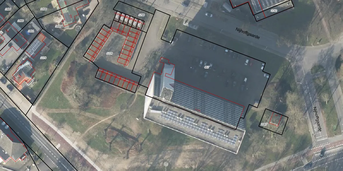 Het perceel waarop Nijhoffgaarde 39 staat heeft een oppervlakte van 2993 m². Dit is een zeer groot perceel. De perceeloppervlakte wordt geregistreerd door het Kadaster. Gedetailleerde informatie over de maten van dit perceel kunt u vinden in het rapport Kadastrale kaart met maatvoering van Nijhoffgaarde 39.