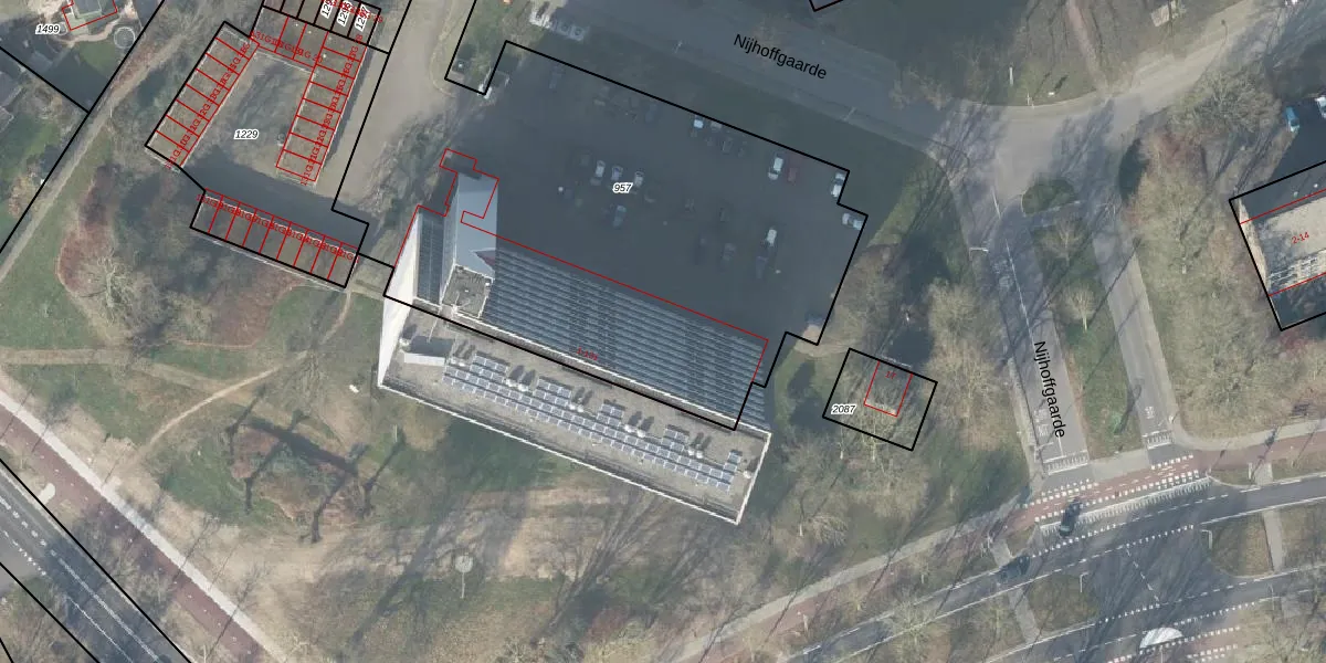 Het perceel waarop Nijhoffgaarde 57 staat heeft een oppervlakte van 2993 m². Dit is een zeer groot perceel. De perceeloppervlakte wordt geregistreerd door het Kadaster. Gedetailleerde informatie over de maten van dit perceel kunt u vinden in het rapport Kadastrale kaart met maatvoering van Nijhoffgaarde 57.