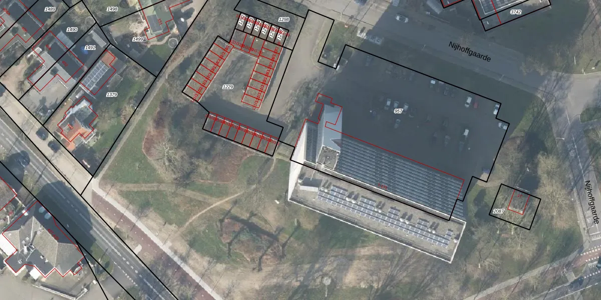 Het perceel waarop Nijhoffgaarde 97 staat heeft een oppervlakte van 2993 m². Dit is een zeer groot perceel. De perceeloppervlakte wordt geregistreerd door het Kadaster. Gedetailleerde informatie over de maten van dit perceel kunt u vinden in het rapport Kadastrale kaart met maatvoering van Nijhoffgaarde 97.