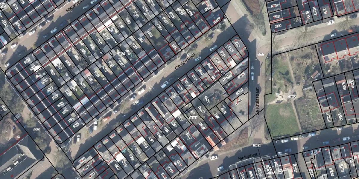 Het perceel waarop Oosterstraat 62 staat heeft een oppervlakte van 68 m². Dit is een klein perceel. De perceeloppervlakte wordt geregistreerd door het Kadaster. Gedetailleerde informatie over de maten van dit perceel kunt u vinden in het rapport Kadastrale kaart met maatvoering van Oosterstraat 62.