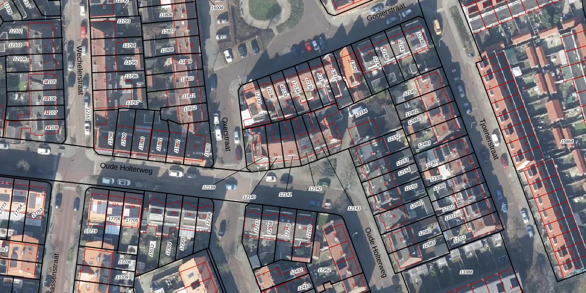 Oude Holterweg 33 is gelegen op kadastraal perceel DVT00B12141. Deze kadastrale aanduiding is uniek en wordt gebruikt door het Kadaster om eigendomsrechten en andere zakelijke rechten vast te leggen. Het perceel maakt onderdeel uit van de kadastrale gemeente Deventer.