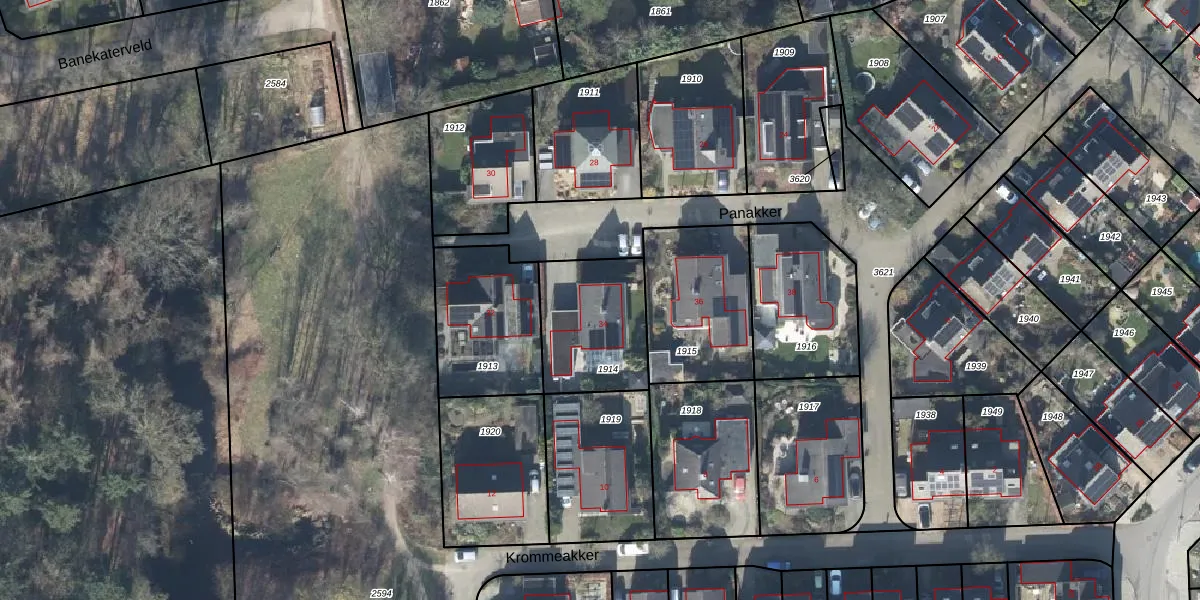 Het perceel waarop Panakker 34 staat heeft een oppervlakte van 387 m². Dit is een groot perceel. De perceeloppervlakte wordt geregistreerd door het Kadaster. Gedetailleerde informatie over de maten van dit perceel kunt u vinden in het rapport Kadastrale kaart met maatvoering van Panakker 34.