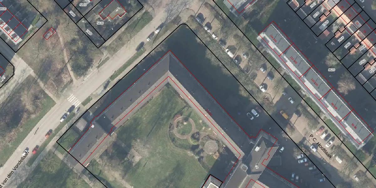 Het perceel waarop P.C. Hooftlaan 167 staat heeft een oppervlakte van 1,2 ha. Dit is een zeer groot perceel. De perceeloppervlakte wordt geregistreerd door het Kadaster. Gedetailleerde informatie over de maten van dit perceel kunt u vinden in het rapport Kadastrale kaart met maatvoering van P.C. Hooftlaan 167.