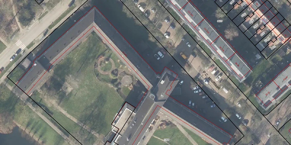 Het perceel waarop P.C. Hooftlaan 185 staat heeft een oppervlakte van 1,2 ha. Dit is een zeer groot perceel. De perceeloppervlakte wordt geregistreerd door het Kadaster. Gedetailleerde informatie over de maten van dit perceel kunt u vinden in het rapport Kadastrale kaart met maatvoering van P.C. Hooftlaan 185.