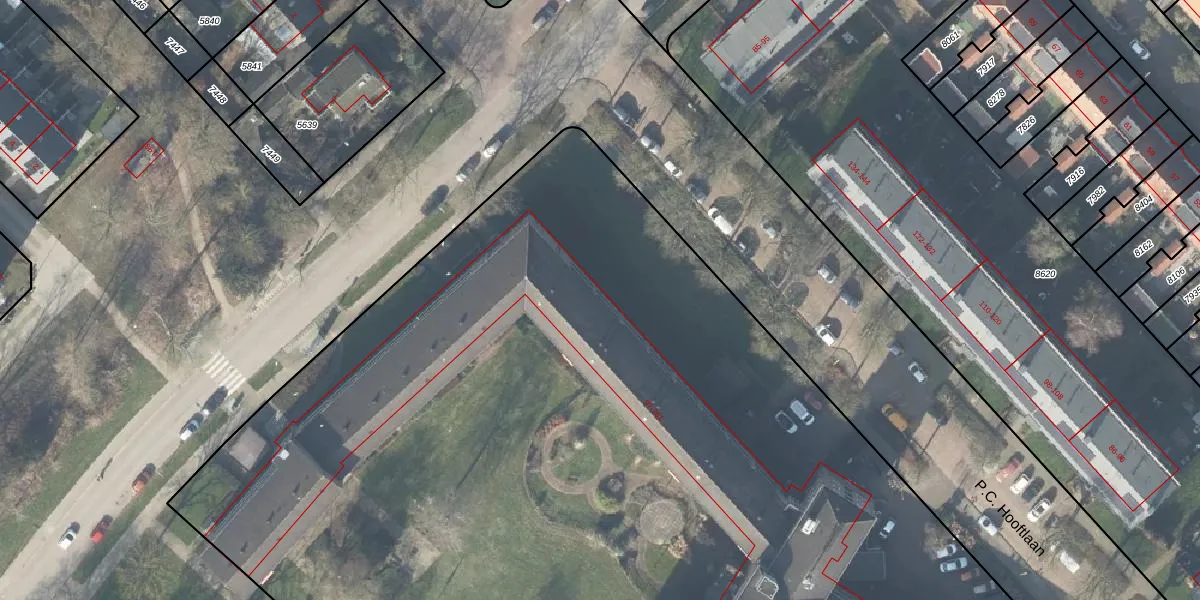 Het perceel waarop P.C. Hooftlaan 201 staat heeft een oppervlakte van 1,2 ha. Dit is een zeer groot perceel. De perceeloppervlakte wordt geregistreerd door het Kadaster. Gedetailleerde informatie over de maten van dit perceel kunt u vinden in het rapport Kadastrale kaart met maatvoering van P.C. Hooftlaan 201.