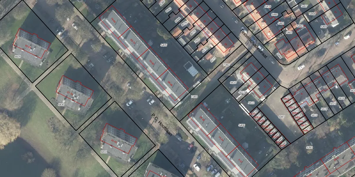 Het perceel waarop P.C. Hooftlaan 40 staat heeft een oppervlakte van 1976 m². Dit is een zeer groot perceel. De perceeloppervlakte wordt geregistreerd door het Kadaster. Gedetailleerde informatie over de maten van dit perceel kunt u vinden in het rapport Kadastrale kaart met maatvoering van P.C. Hooftlaan 40.