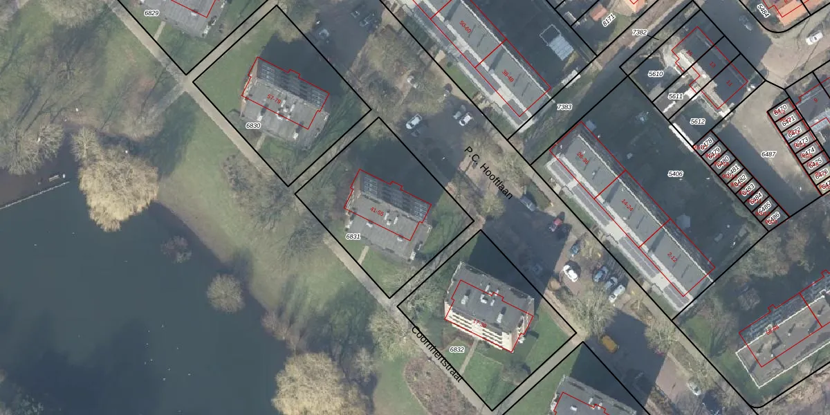 Het perceel waarop P.C. Hooftlaan 41 staat heeft een oppervlakte van 936 m². Dit is een groot perceel. De perceeloppervlakte wordt geregistreerd door het Kadaster. Gedetailleerde informatie over de maten van dit perceel kunt u vinden in het rapport Kadastrale kaart met maatvoering van P.C. Hooftlaan 41.