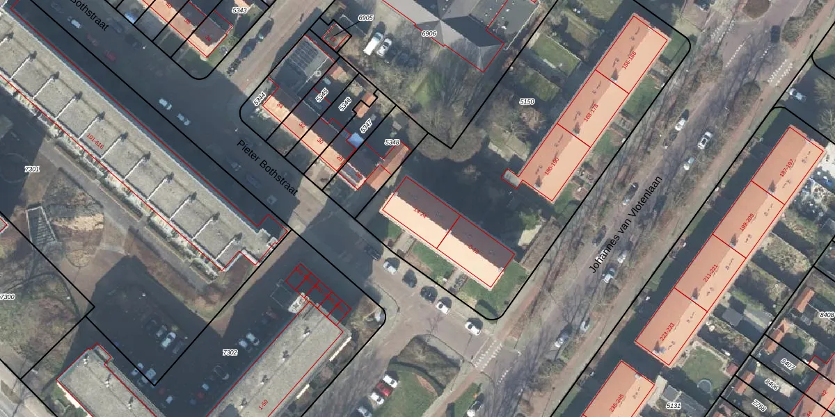 Het perceel waarop Pieter Bothstraat 22 staat heeft een oppervlakte van 2955 m². Dit is een zeer groot perceel. De perceeloppervlakte wordt geregistreerd door het Kadaster. Gedetailleerde informatie over de maten van dit perceel kunt u vinden in het rapport Kadastrale kaart met maatvoering van Pieter Bothstraat 22.