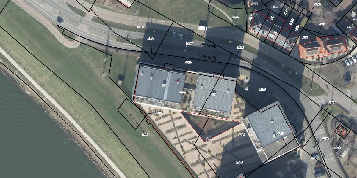 Het perceel waarop Pothoofd 24 staat heeft een oppervlakte van 5693 m². Dit is een zeer groot perceel. De perceeloppervlakte wordt geregistreerd door het Kadaster. Gedetailleerde informatie over de maten van dit perceel kunt u vinden in het rapport Kadastrale kaart met maatvoering van Pothoofd 24.