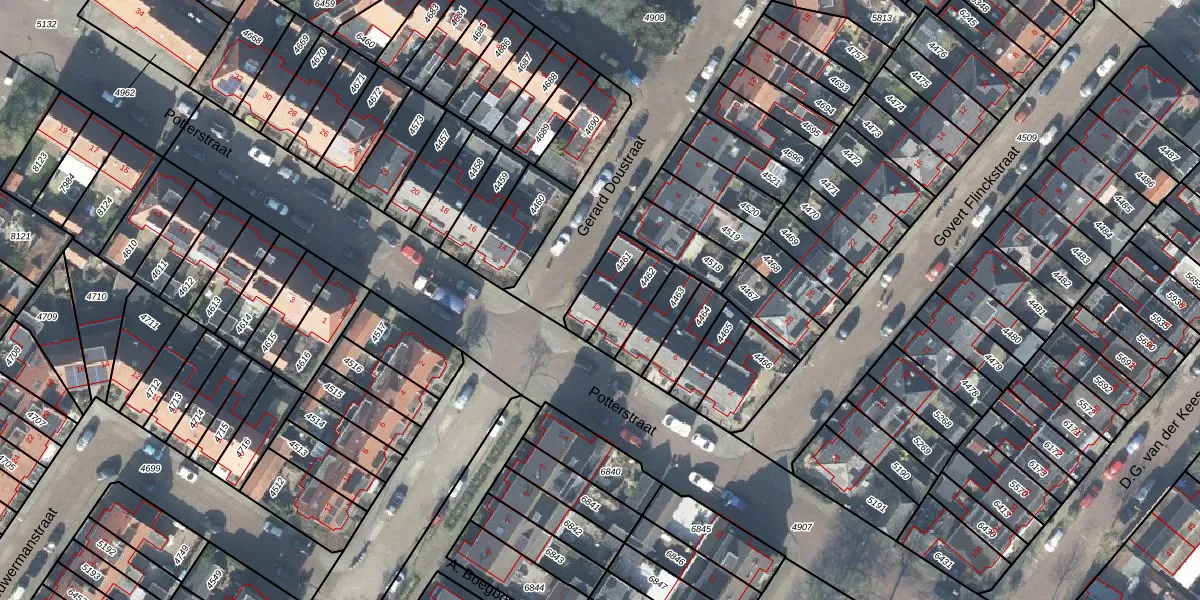 Het perceel waarop Potterstraat 12 staat heeft een oppervlakte van 102 m². Dit is een middelgroot perceel. De perceeloppervlakte wordt geregistreerd door het Kadaster. Gedetailleerde informatie over de maten van dit perceel kunt u vinden in het rapport Kadastrale kaart met maatvoering van Potterstraat 12.