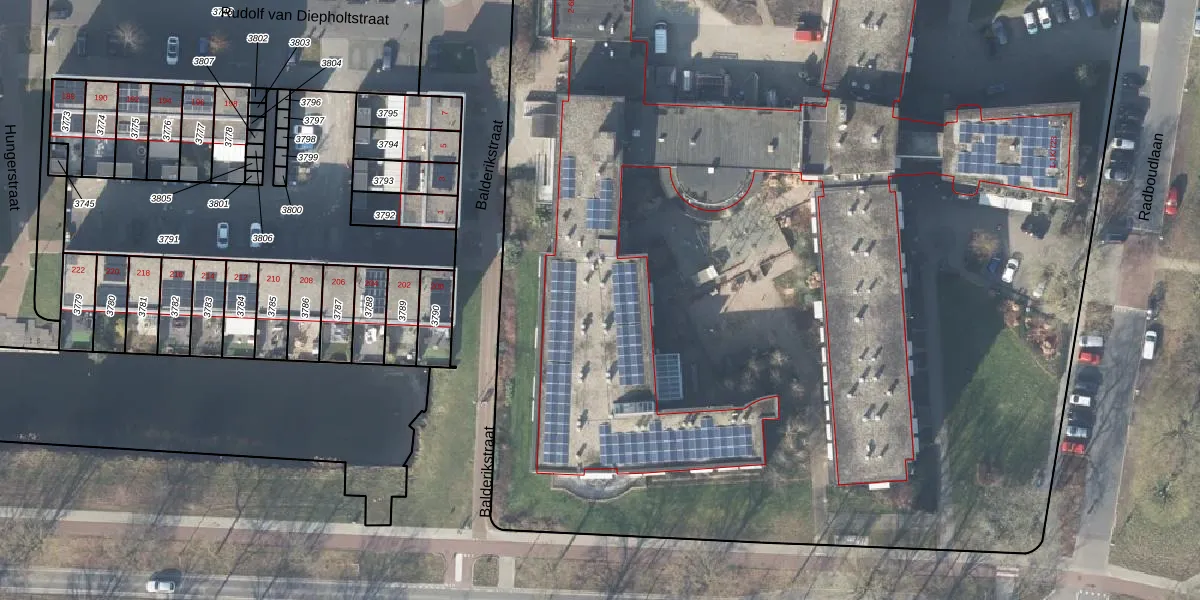 Het perceel waarop Radboudlaan 1-K-709 staat heeft een oppervlakte van 1,8 ha. Dit is een zeer groot perceel. De perceeloppervlakte wordt geregistreerd door het Kadaster. Gedetailleerde informatie over de maten van dit perceel kunt u vinden in het rapport Kadastrale kaart met maatvoering van Radboudlaan 1-K-709.